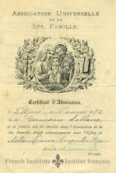 Certificat d'Admission, Association Universelle de la Ste. Famille, 1893