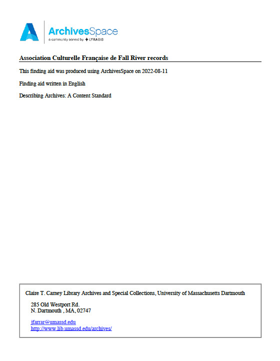 The majority of the collection consists of French-language newspapers and clippings pertaining to prominent members of the Fall River community, Franco-American organizations, and medical associations. The collection also contains notes, correspondence, and speeches from the various organizations of which Dr. Boivin was a member; programs for conferences and celebrations from The French Cultural Association and The St. Anne School; and a black and white photograph of the Lafayette Monument on Eastern Avenue in Fall River. The most notable item in the collection is a large 18x13x4 indexed scrapbook which contains newspaper clippings on local doctors, lawyers, church and school leaders of French Canadian descent, as well as events, organizations, and associations within the French Canadian community of Fall River. The bulk of these clippings date from 1935-1977. The scrapbook also contains thank you notes, cards, and photographs which are attached to the inside covers.