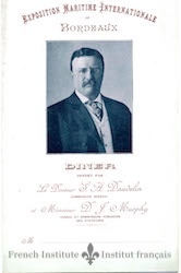 Program for a dinner hosted by Dr. Daudelin in his role as High Commissioner of the U.S. to the International Maritime Exposition. The program includes both the menu and list of wines. An image of President Theodore Roosevelt is on the front cover, and an image of the U.S. Pavilion at the exposition is on the back cover.