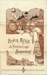 Program for a dinner hosted by the Russian representative to the International Maritime Exposition. The program includes both the menu and list of wines.