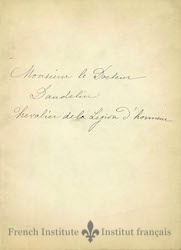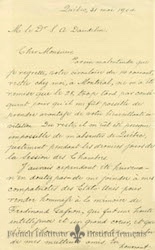 A letter from a wine and spirits syndicat, to S. Alphonse Daudelin. The letter expresses the well wishes of the Syndicat upon the news that Daudelin was to become a chevalier in the Legion d'Honneur.