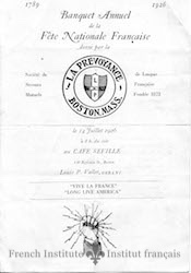 A dinner program for the Banquet Annuel de la Fête Nationale Française, 14 July 1926. Hosted by the Société de Secours Mutuels de Langue Française, at the Cafe Seville on Boylston Street in Boston, MA.