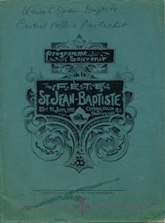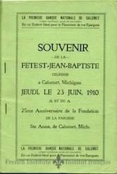 A souvenir booklet for the Fete St-Jean-Baptiste, held in Calumet, Michigan, 23 June 1910. The event was held in conjunction with the 25th anniversary of the founding of St. Anne's Parish, also in Calumet, MI.