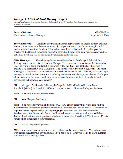 Beliveau, Severin, "Interview with Severin Beliveau by Mike Hastings" (2008). George J. Mitchell Oral History Project. 184.