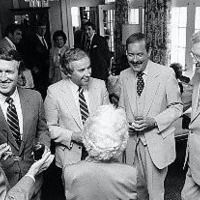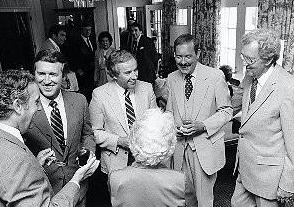 - en Senators Cohen, Muskie, Smith, Joe Brennan and others socializing at Blaine house luncheon during Smith-Muskie buildings dedication.