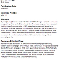 Interview includes discussions of: family political history; Bangor political history; brother’s election campaigns for secretary of state, Maine House of Representatives and Senate; McGovern campaign in 1972; Maine gubernatorial campaign, 1986; Watergate; 1954 Maine gubernatorial campaign; prejudice against Catholics in Maine; Women’s Rights movement; Maine Teacher’s Association Women’s Caucus; Maine Women’s Lobby; Gore campaign; personal meetings with Muskie; changes in the Democratic Party; Severin Beliveau; Janet Mills; and Albert Beliveau.