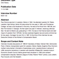 Interview includes discussions of: 1980-81 Secretary of State; Vietnam War; Democratic Party in Maine; transportation grant for Lewiston, Maine; Nestle; Angeline (Paul Dionne’s mother) instrumental in formation of seamstress union; Lewiston/Auburn campus of USM; economic transitions in Lewiston with downfall of Bates Mill; Lewiston-Auburn Economic Growth Council; Maine government shutdown in 1993 over workers’ compensation disputes; National League of Cities; Roland “Rollo” Landry; Louis Jalbert; Paul Couture; and Hal Gosselin.