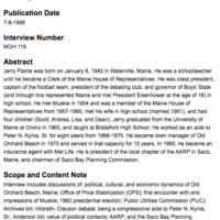 Interview includes discussions of: political, cultural, and economic dynamics of Old Orchard Beach, Maine; Office of Price Stabilization (OPS); first encounter with and impressions of Muskie; 1960 presidential election; Public Utilities Commission (PUC); Archives bill; Hildreth- Clauson debate; being a congressional aide to Peter N. Kyros, Sr.; Anderson bill; value of political contacts; AARP; and the Saco Bay Planning Commission.