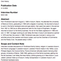 Interview includes discussions of: Pontbriand family history; religion in Lewiston-Auburn; the French Language in Lewiston-Auburn; Lewiston French media in the 1940s; Louis-Philippe Gagne; the Couture family; Franco-American attitudes toward marrying other groups; University of Maine, 1946-1950; getting out of the family business; getting into the ski business; Lost Valley Ski Area history; politics growing up in New Auburn; Louis Jalbert; political make-up of Auburn; trolley transportation in Lewiston-Auburn; and Pontbriand hardware store.