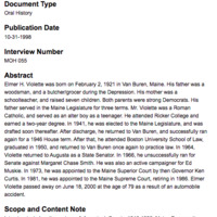 Interview includes discussions of: Aroostook County, 1946-1999; Maine Democratic Party post- 1946; Party organization; Violette’s contributions to the 1960s Maine legislature; the seclusion of Aroostook County; Dickey-Lincoln; Allagash Wilderness Waterway; Sumner Pike; running against Margaret Chase Smith; 1968 Maine Convention debates; Ed Muskie’s 1968 Vice Presidential campaign; Congressional campaigns of the early 1970s; politics as a justice; Bob Haskell; and John Martin.