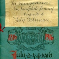 A typescript copy of "Les Vengeances" by Pamphile Lemay. The script is pasted into an older Franco-American program from 1916. This was Gatineau's personal working copy, and he played the role of Lozet. The play was performed at the Theatre Blanchard on 3 March 1924.