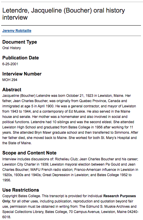 Edmund S. Muskie Oral History Collection: Jacqueline (Boucher) Letendre