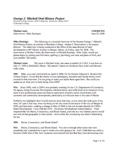 Aube, Michael 'Mike', "Interview with Michael Aube by Mike Hastings" (2009). George J. Mitchell Oral History Project. 189.